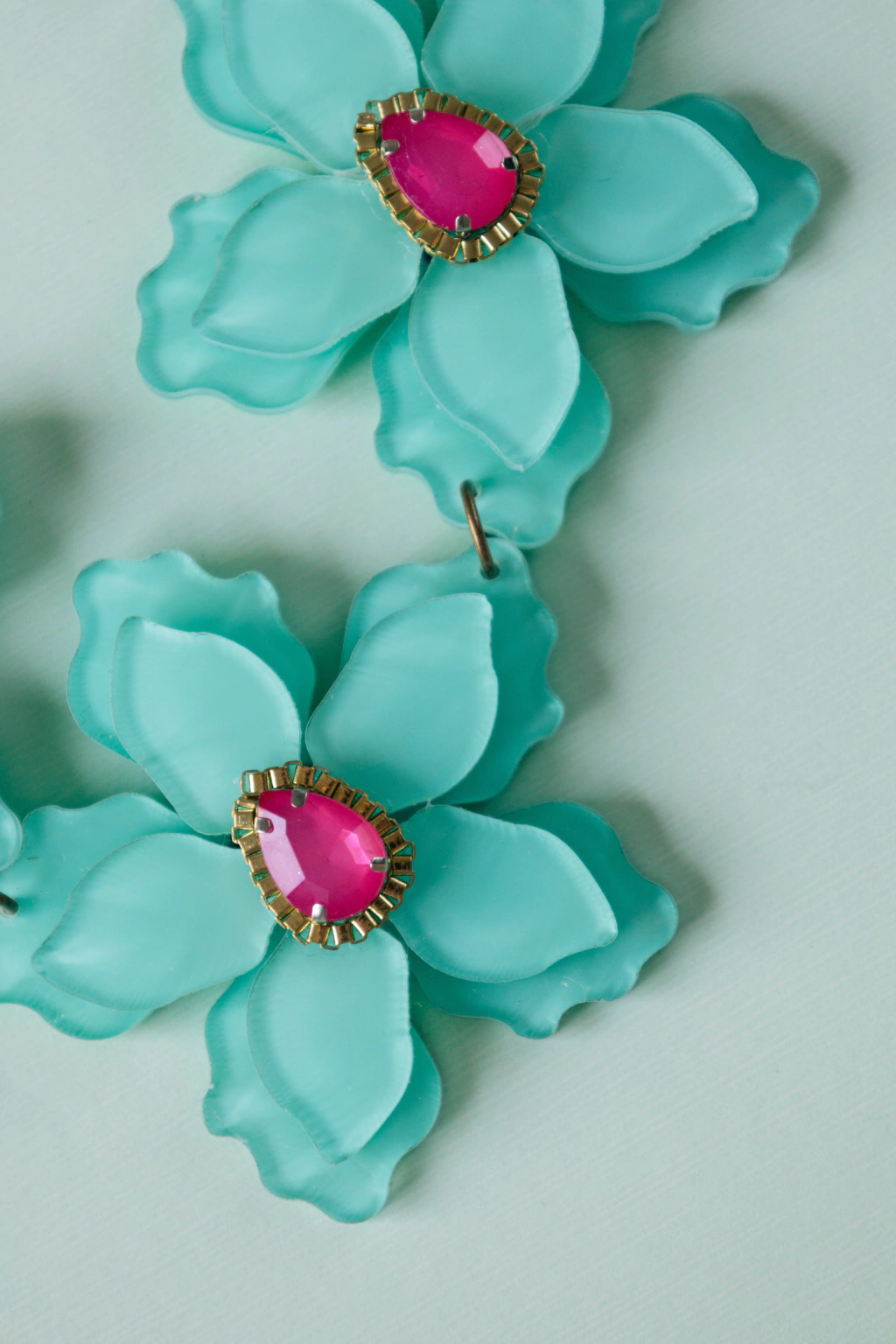 Collar con base de acrílico en forma de flor, con piedras engarzadas y cadena de metal con baño color bronce.