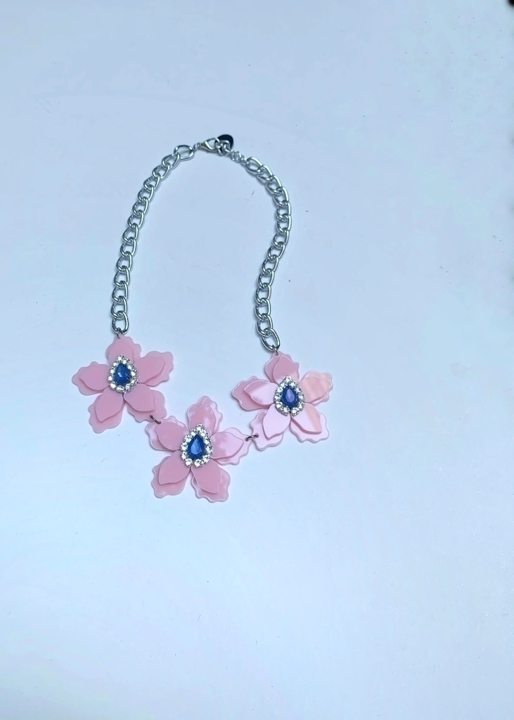 Collar con base de acrílico en forma de flor, con piedras engarzadas y cadena de metal con baño plateado