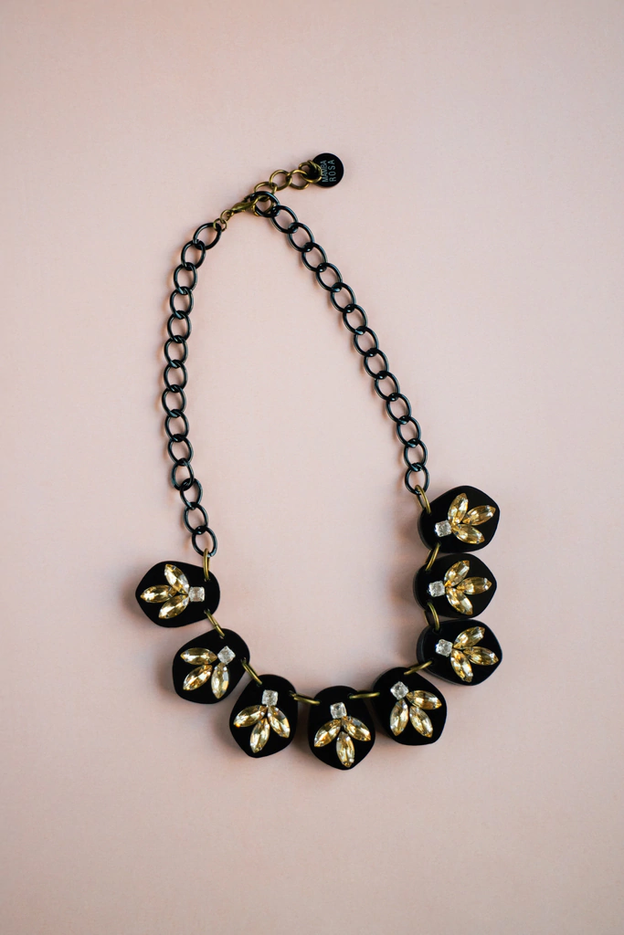Collar con bases de acrílico , piedras engarzadas y cadena de aluminio con baño en negro.