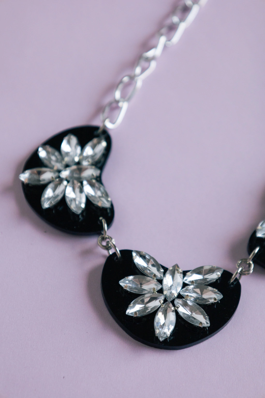 Collar con bases de acrílico en color negro con piedras engarzadas y cadena de aluminio color plateado.